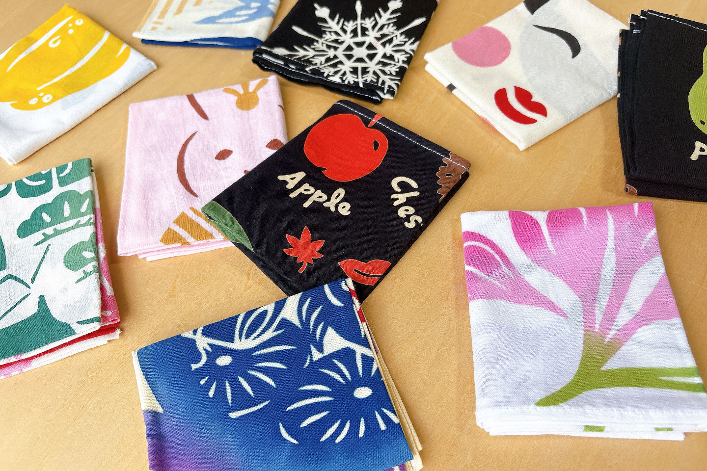 普段使いにもぴったりのサイズ(約43×33cm)で、ハンカチやランチョンマットとしても使いやすく、手軽に注染の良さを体験していただけます。色や柄の組み合わせも豊富で、日常のさりげないおしゃれを楽しむことができます。